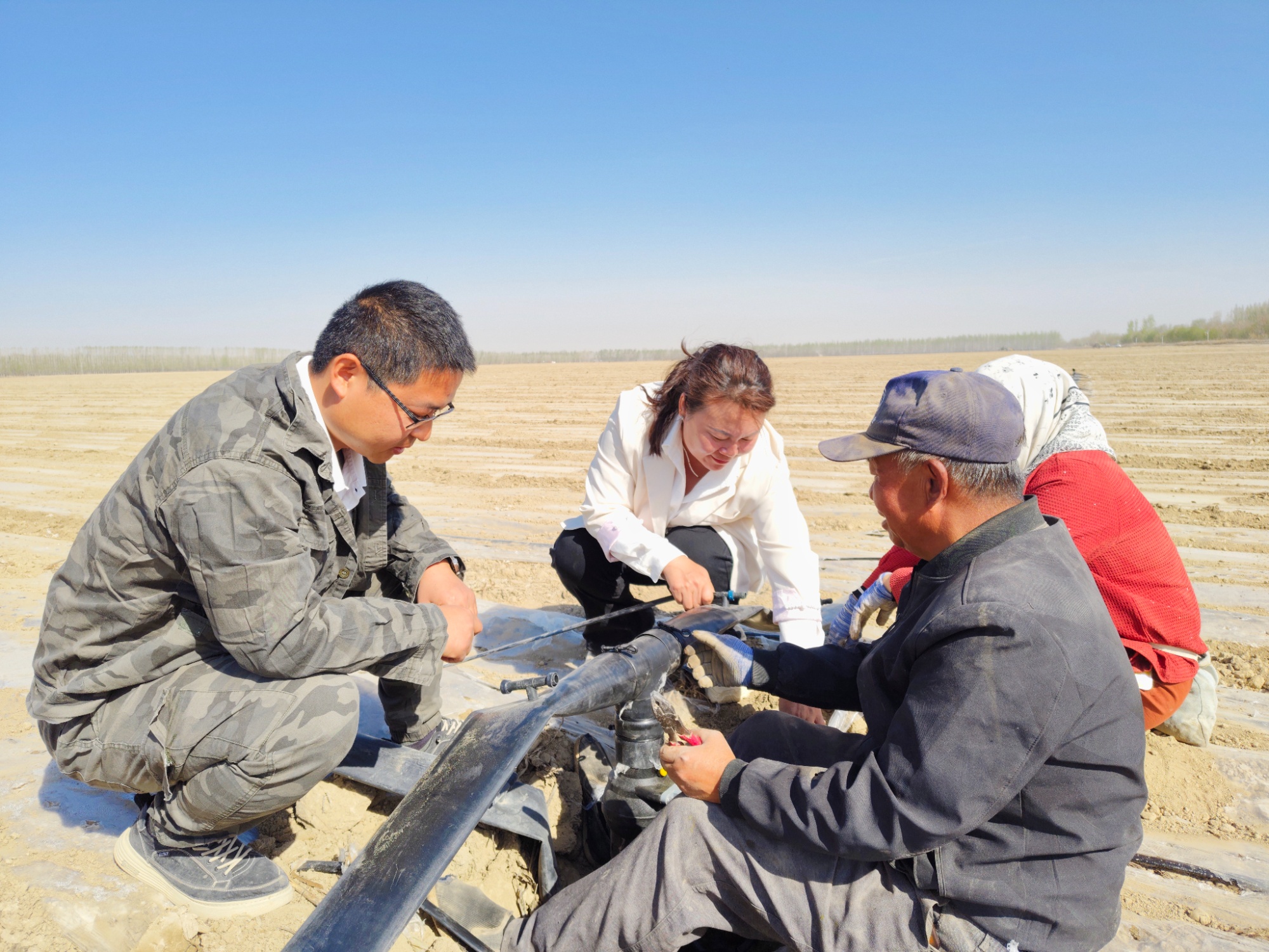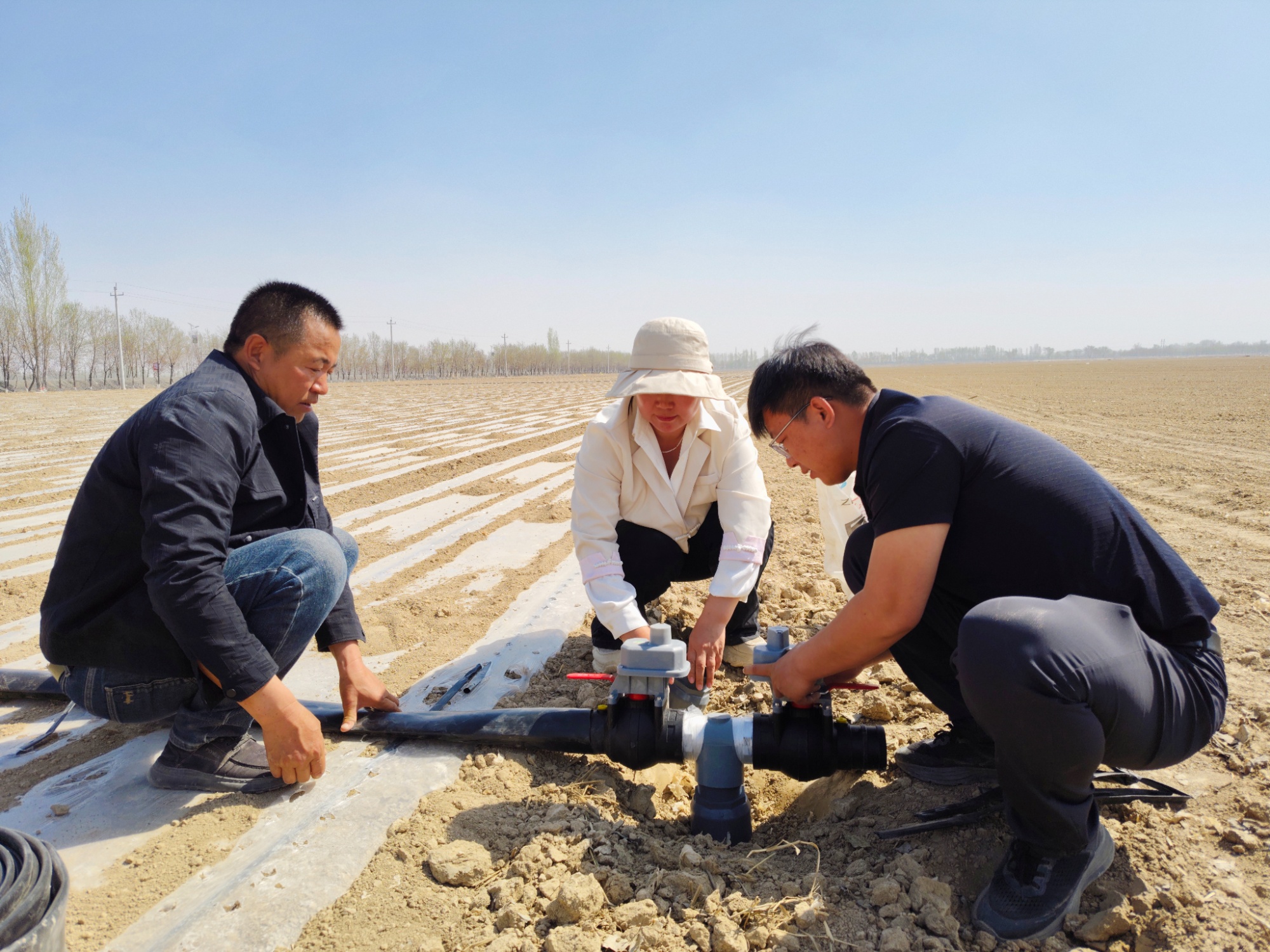 中国农业科学院棉花研讨所棉花才智培养立异团队副研讨员杨北方(左一)正在现场辅导员工装置智能电子球阀 (石海 摄)