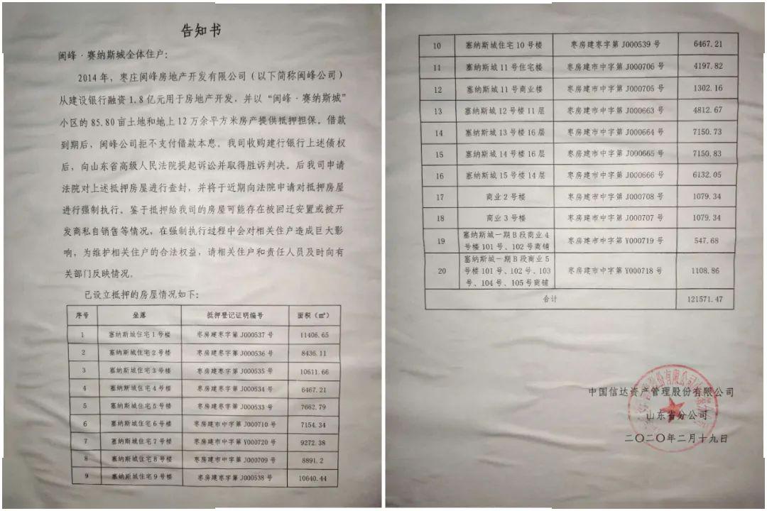 2014年塞纳斯城开发商枣庄闽峰开发公司从建设银行融资1.8亿并以该小区85.80亩土地和地上12万余平方房产提供抵押担保,我司已经向法院申请强制执行.........