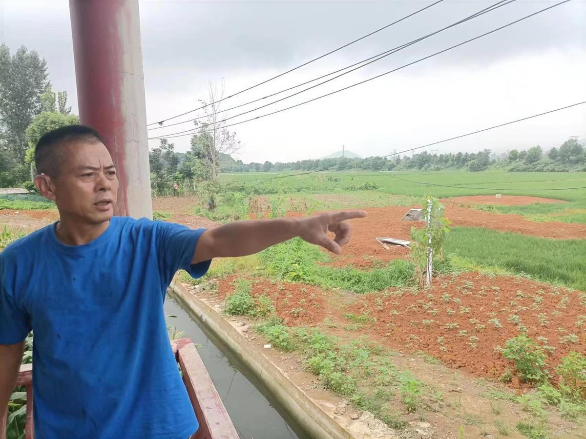 曹大庆指着稻田有黄土覆盖的地方称那些都是塌陷的区域 极目新闻记者梁传松摄