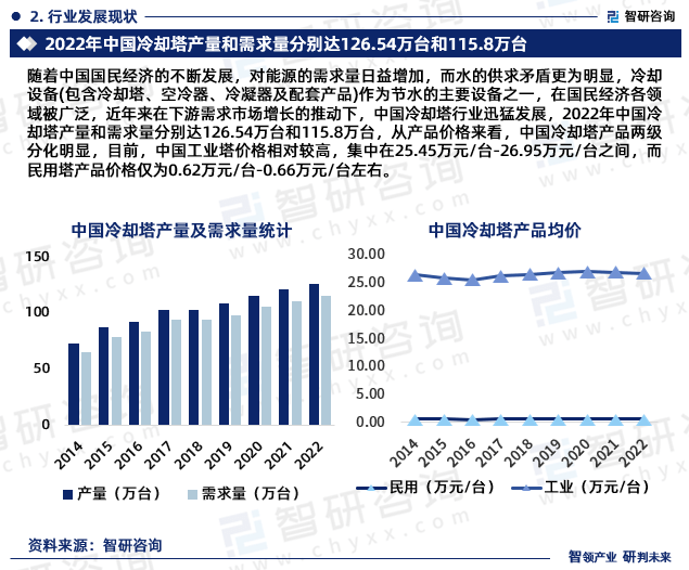 随着中国国民经济的持续不断的发展,对能源的需求量日益增加,而水的供求矛盾更明显,冷却设备(包含冷却塔、空冷器、冷凝器及配套产品)作为节水的主要设备之一,在国民经济各领域被广泛,近年来在下游需求市场增长的推动下,中国冷却塔行业迅猛发展,2022年中国冷却塔产量和需求量分别达126.54万台和115.8万台,从产品价格来看,中国冷却塔产品两级分化明显,目前,中国工业塔价格相比来说较高,集中在25.45万元/台-26.95万元/台之间,而民用塔产品价格仅为0.62万元/台-0.66万元/台左右。