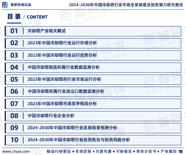 《2024-2030年中国冷却塔行业市场全景调查及投资潜力研究报告》内容丰富、数据翔实、亮点纷呈。是智研咨询重要研究成果,是智研咨询引领行业变革、寄情行业、践行使命的有力体现,更是冷却塔领域从业者把脉行业不可或缺的重要工具。智研咨询已形成一套完整、立体的智库体系,多年来服务政府、企业、金融机构等,提供科技、咨询、教育、生态、资本等服务。