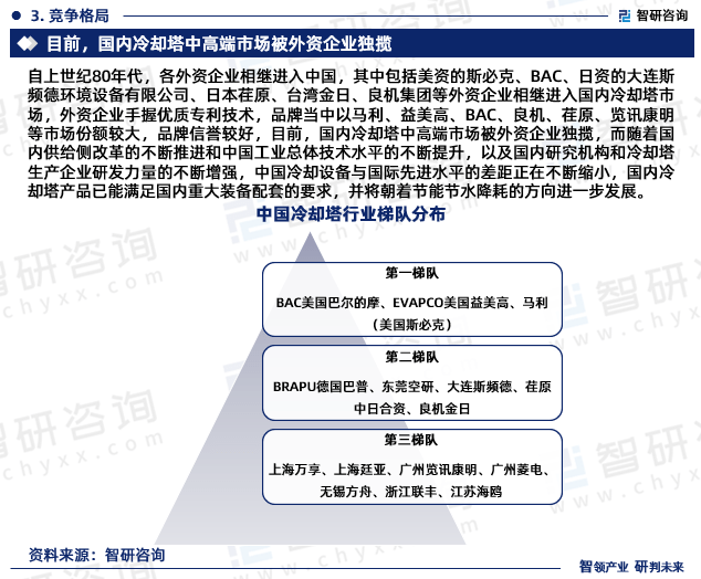 自上世纪80年代,各外资企业相继进入中国,这中间还包括美资的斯必克、BAC、日资的大连斯频德环境设备有限公司、日本荏原、台湾金日、良机集团等外资企业相继进入国内冷却塔市场,外资企业手握优质专利技术,品牌当中以马利、益美高、BAC、良机、荏原、览讯康明等市场占有率较大,品牌信誉较好,目前,国内冷却塔中高端市场被外资企业独揽,而随着国内供给侧改革的不断推进和中国工业总体技术水平的不断的提高,以及国内研究机构和冷却塔生产企业研发力量的慢慢地加强,中国冷却设备与国际领先水平的差距正在不断缩小,国内冷却塔产品已能满足国内重大装备配套的要求,并将朝着节能节水降耗的方向进一步发展。