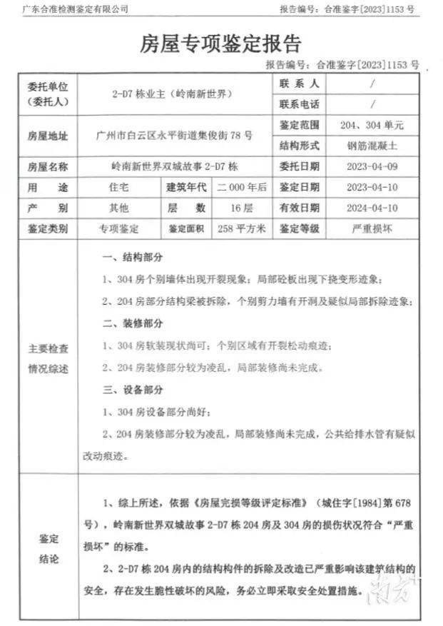 随后,业主们聘请鉴定公司对该楼栋的204和304房进行了房屋安全鉴定。4月12日,广东合准检测鉴定有限公司出具的鉴定报告数据显示,204房和304房符合“严重破损毁坏”的标准,结构构件拆除已极度影响该建筑结构的安全,存在发生脆性破坏的风险。